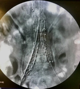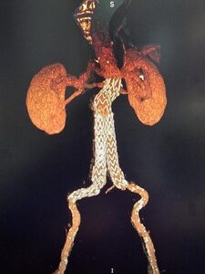 - Ενδαγγειακή αποκατάσταση κοιλιακού ανευρύσματος (EVAR) : Πρόκειται για μία τεχνική που έχει αναπτυχθεί ιδιαίτερα τα τελευταία χρόνια και έχει αντικαταστήσει σε μεγάλο βαθμό την ανοιχτή χειρουργική αποκατάστασή. Είναι σημαντικό να τονιστεί ότι πρόκειται για ελάχιστα επεμβατική μέθοδο, ο ασθενής έχει ταχύτερη ανάρρωση, με μειωμένη παραμονή στο νοσοκομείο και αισθητά λιγότερο άλγος. Η σίτιση του αρχίζει την ίδια μέρα, ενώ η κινητοποίησή αρχίζει την επομένη της επέμβασης.